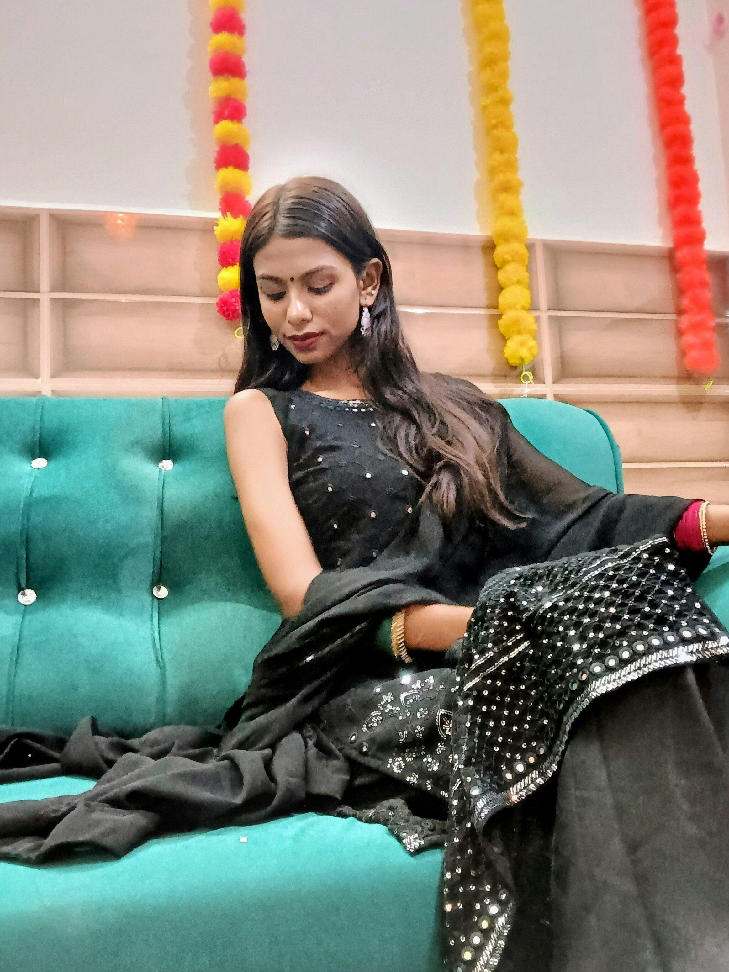 Elevate your festive look with this Black Anarkali Suit, adorned with delicate thread embroidery, sparkling sequins, and real mirror work. Crafted for both comfort and elegance, this 3-piece set comes with a matching dupatta, making it a perfect choice for weddings, parties, and special occasions.