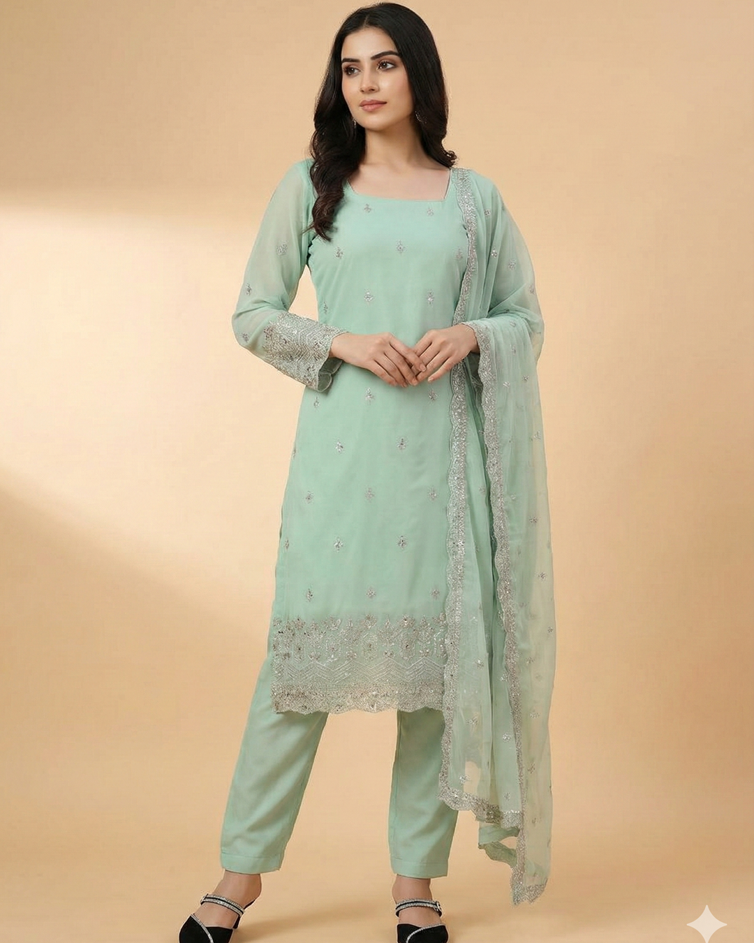 "Elevate your ethnic wardrobe with this stunning Sage Green Faux Georgette Suit Set. Featuring intricate silver embroidery and a flowy silhouette, this 3-piece set (Kurti, Pant, Dupatta) is perfect for weddings, parties, and festive occasions. Lightweight, comfortable, and stylish."