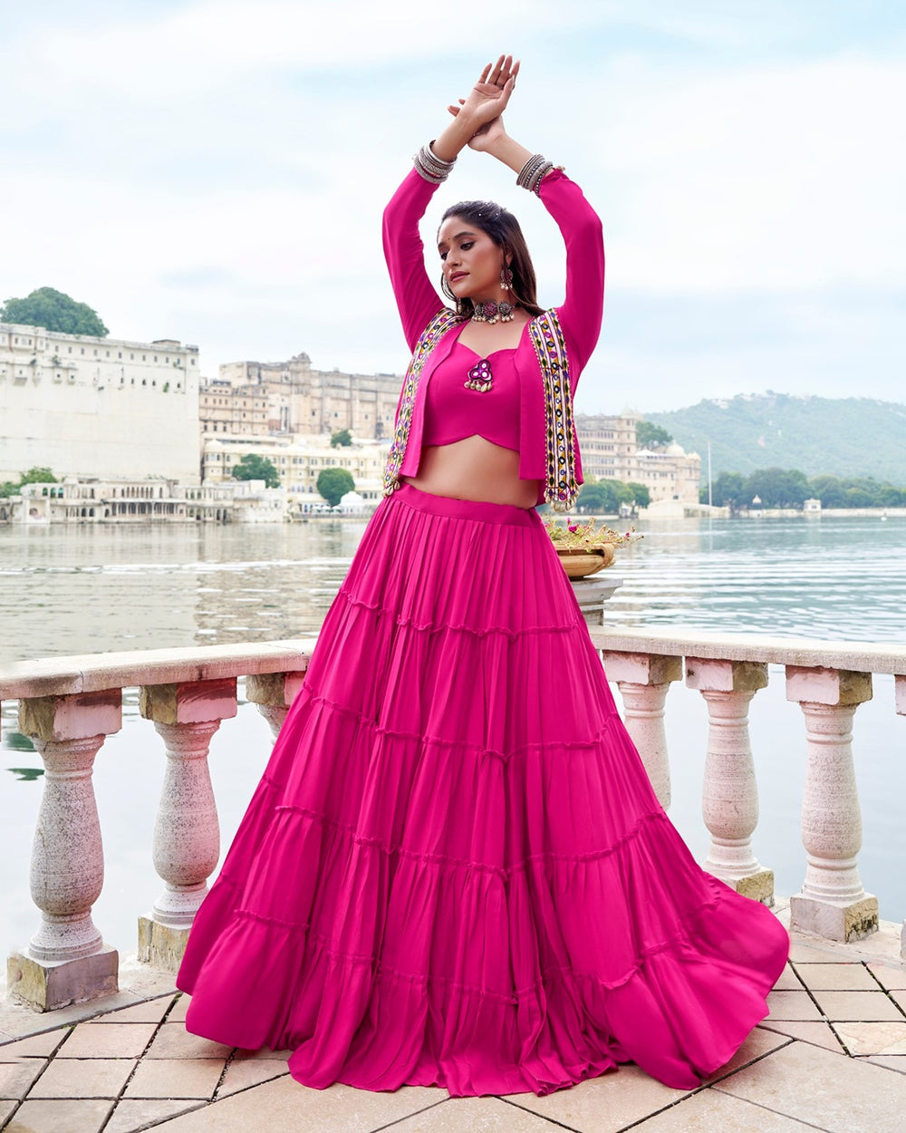 Celebrate Navratri in style with this Festive Pink Rayon Lehenga Choli, designed with graceful detailing for a touch of elegance. Crafted from soft rayon, it offers comfort, charm, and traditional beauty for your garba and festive nights.