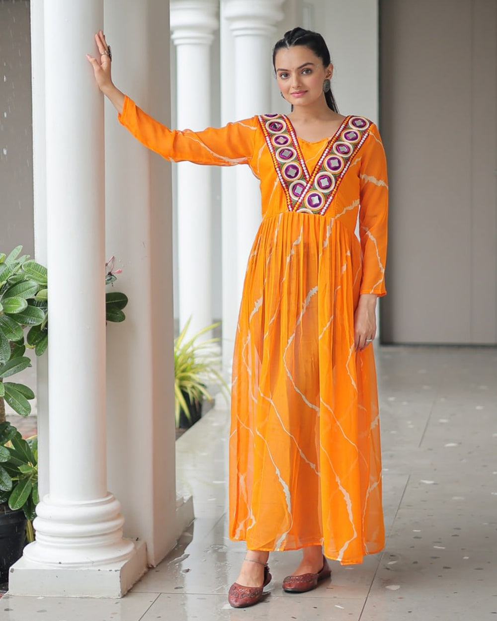 Shine bright this festive season in our yellow faux georgette kurti, intricately adorned with traditional Kutchi embroidery. Lightweight, breezy, and vibrant—crafted for joyful Garba nights and cultural celebrations.
