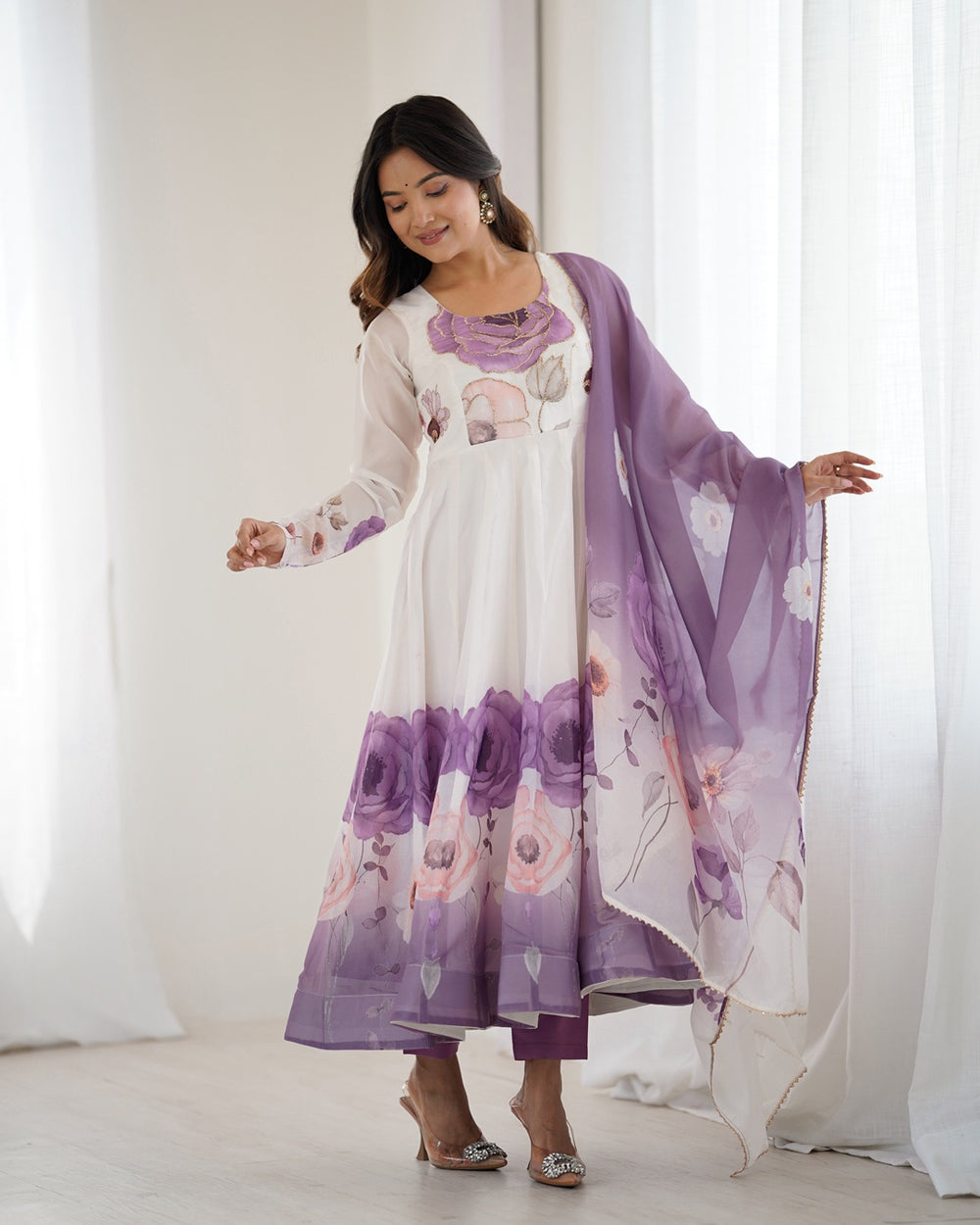 Add a touch of sophistication to your festive wardrobe with this Violet Floral Print Organza Anarkali Suit. Crafted in a graceful three-piece set, it includes a flowy organza Anarkali, matching bottoms, and a dupatta adorned with floral detailing. Perfect for weddings, parties, and special occasions, this outfit blends modern elegance with traditional charm.