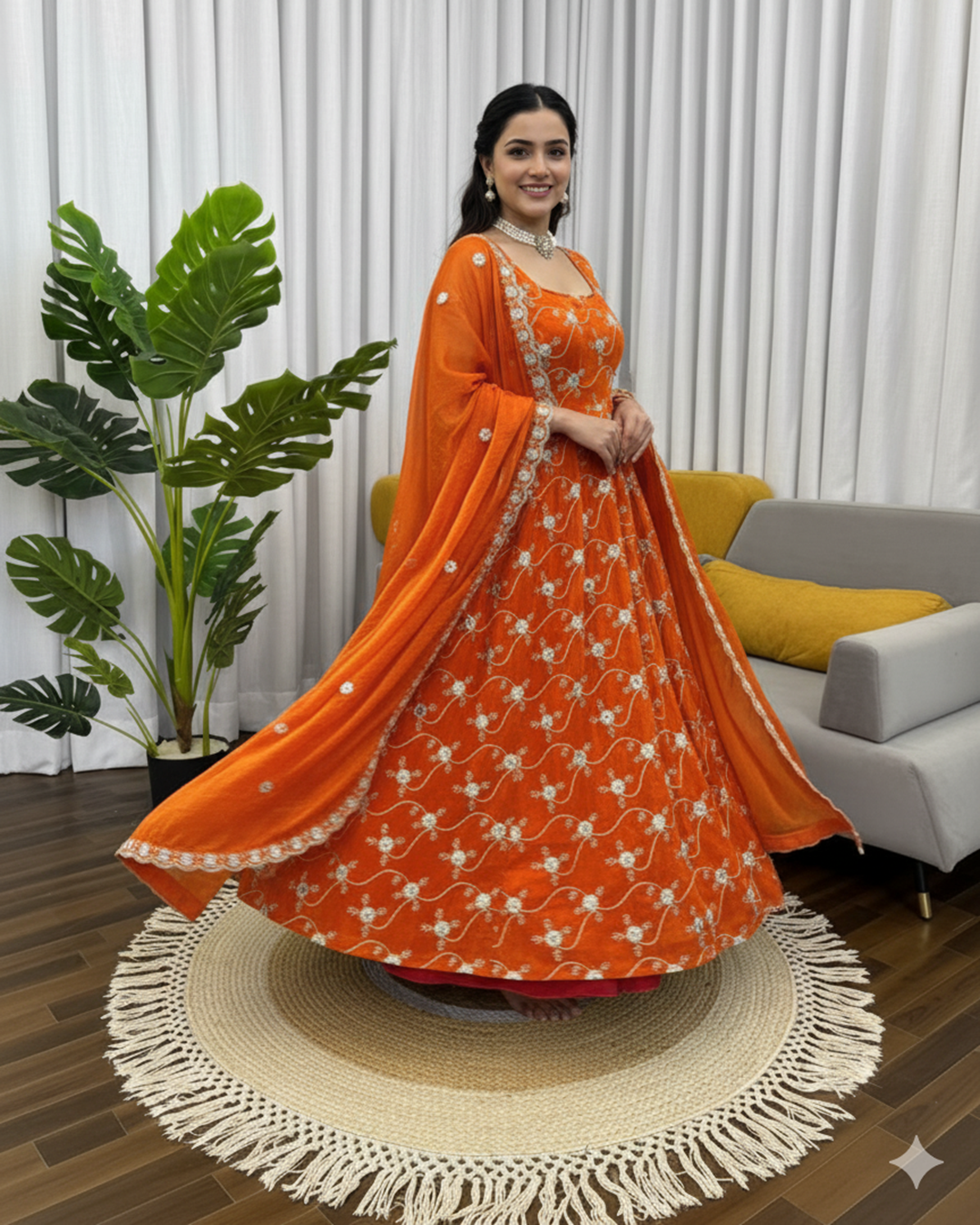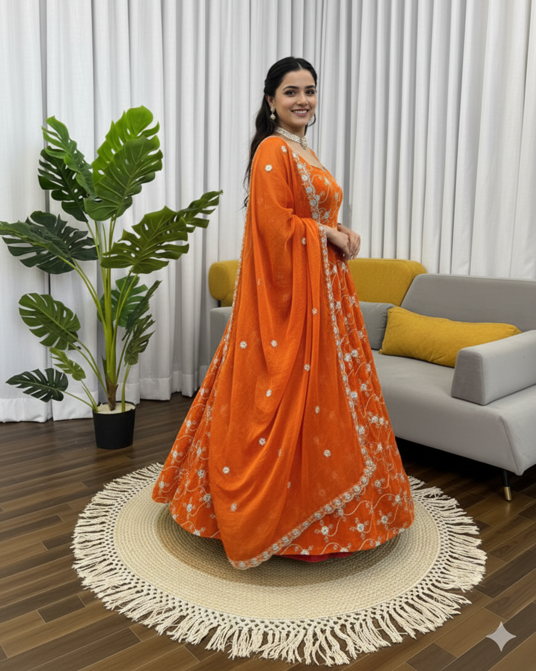 Step into festive elegance with this premium orange designer Anarkali set. Crafted from luxurious fabric and detailed with fine embroidery, this ensemble radiates charm and sophistication — perfect for celebrations, weddings, and special occasions.